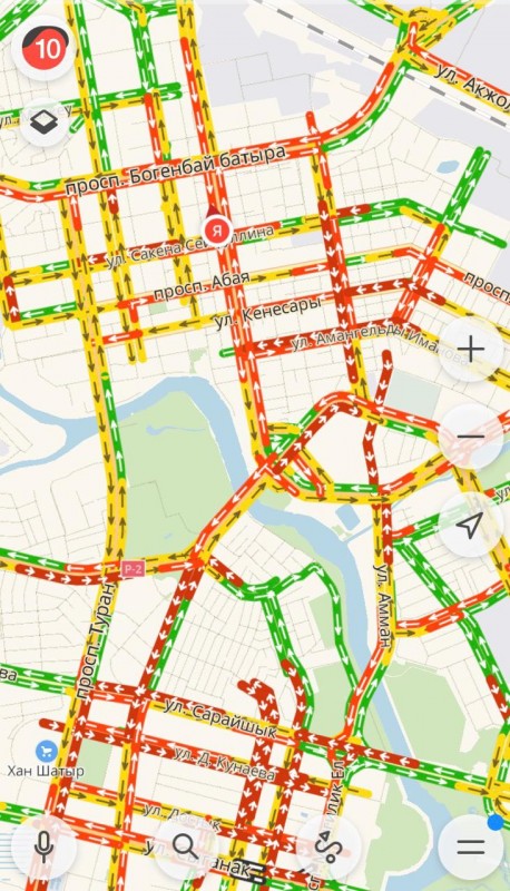 Сервис Яндекс.Карты отображает 10-балльную загруженность на центральных дорогах столицы. Заторы образовались на проспекте Республики, улицах Кенесары, Валиханова, Иманова, Бараева, Кунаева, на проспектах Абая, Богенбай батыра и Туран, улице Акмешит.