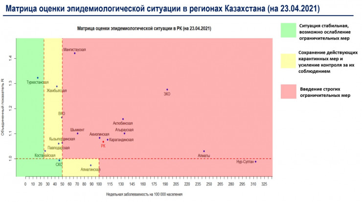 Согласно матрице оценки эпидемиологической ситуации в регионах Казахстана на 23 апреля, в "красной" зоне остаются Нур-Султан, Алматы, Шымкент и Акмолинская, Атырауская, Актюбинская, Западно-Казахстанская, Карагандинская, Кызылординская, Мангистауская области.