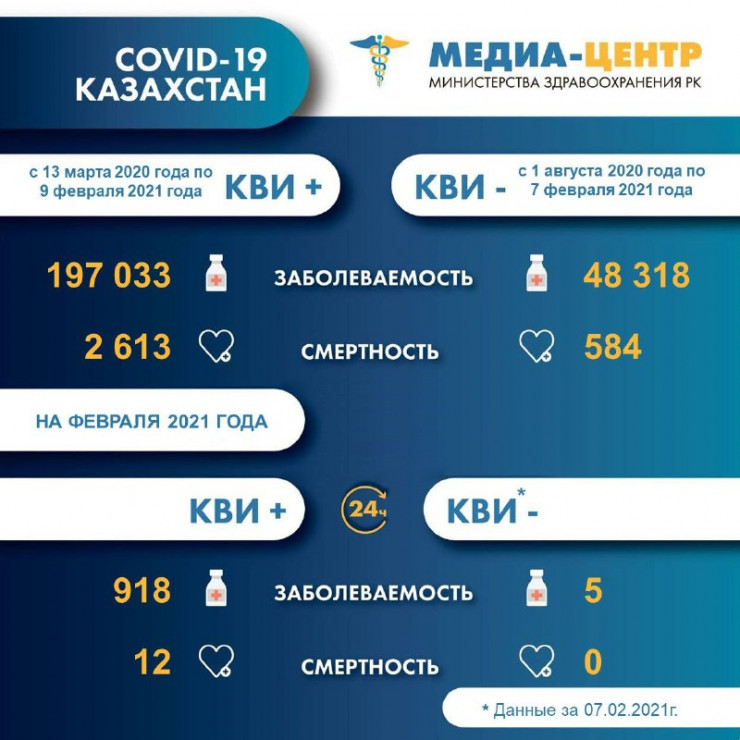 12 казахстанцев скончались от коронавируса за сутки. На 9 февраля лечение от коронавируса продолжают получать 26 380 человек (16 376 КВИ+ и 10 004 КВИ-), из них в стационарах находятся 5 560 пациентов, на амбулаторном уровне - 20 820 пациентов, передает корреспондент Tengrinews.kz.