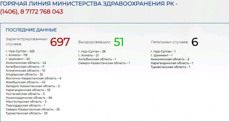 Таким образом, на сегодняшний день в Казахстане подтверждено 697 случаев COVID-19.