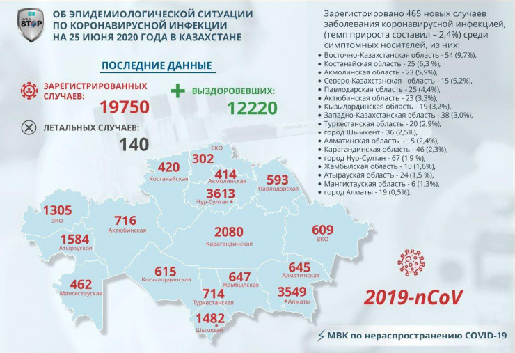 В Восточно-Казахстанской области прирост заболевших составил почти 10 процентов, регион второй день лидирует по процентному приросту. Наименьший прирост в Алматы - за сутки в городе выявлено 19 зараженных, что составляет 0,5 процента прироста.