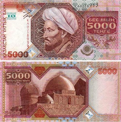 Банкнота номиналом 5000 тенге образца 2001 года к 10-летию независимости Республики Казахстан с юбилейной надписью.