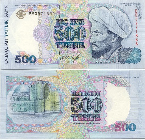 На 500 тенге также изображен аль-Фараби. Размер купюры был 14,4 сантиметра на 6,9 сантиметра. На лицевой стороне были также изображены гравированный орнамент, водяной знак, герб Республики Казахстан.