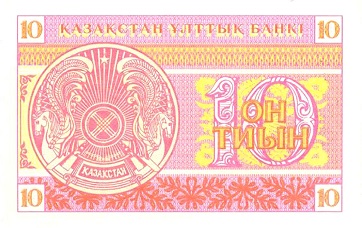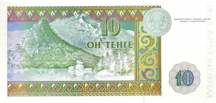 Десять тенге были темно-зелеными с минимальными вкраплениями желтого. Размер банкноты - 14,4 сантиметра на 6,9 сантиметра. На этой банкноте - портрет казахского просветителя Шокана Валиханова в военной форме, а также казахский орнамент. Был и водяной знак.