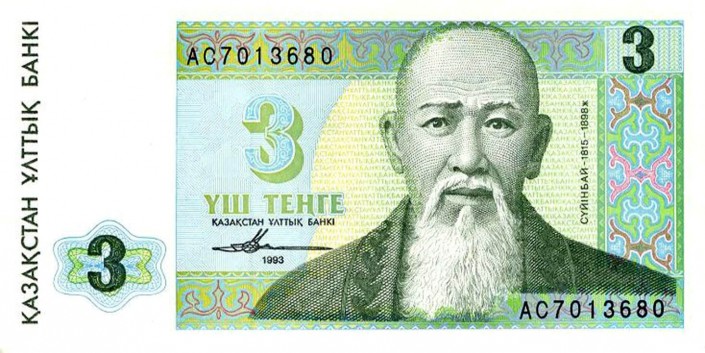 На трехтенговой банкноте размером 12,4 на 6,2 сантиметра - серый и светло-зеленый цвета. На лицевой стороне изображен портрет казахского акына Суюнбая в чапане с узором и без головного убора. На заднем светло-желтом фоне можно разглядеть повторяющееся слово "Казахстан". Казахский национальный орнамент - почти по всему периметру купюры.