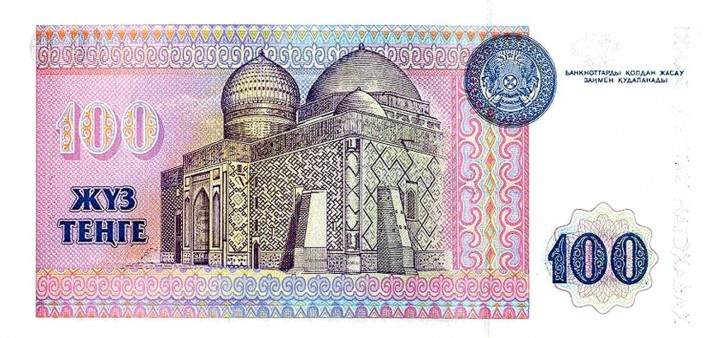 Кроме вышеуказанных, была купюра номиналом 100 тенге. Ее размер составлял 14,4 сантиметра на 6,9 сантиметра. Преобладающие цвета: фиолетовый и темно-синий. На лицевой стороне изображен портрет Абылай хана с накинутой на плечи шубой, в руках он держит, по всей видимости, знак ханской власти. Кроме того, присутствуют гравированный орнамент, водяной знак и номинал.