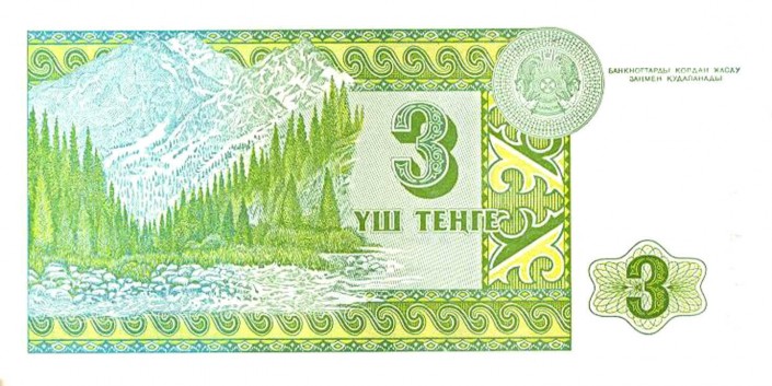 На оборотной стороне трехтенговой банкноты изображены пейзаж Алатау и номинал. Справа в верхнем углу орнаментального рисунка - герб Казахстана.