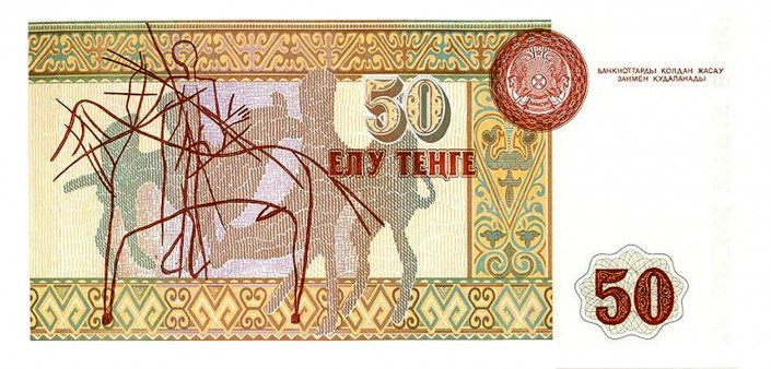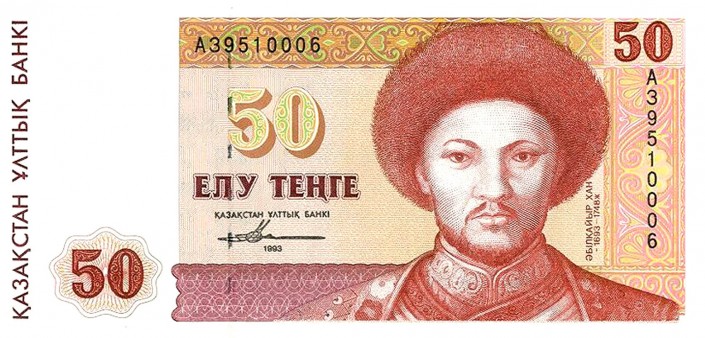 50 тенге были красными. Присутствовали также светло-коричневый и оранжево-желтый цвета. Размер купюры составлял 14,4 сантиметра в длину и 6,9 сантиметра в ширину. На лицевой стороне этой банкноты был изображен портрет Абулхаир хана в национальном головном уборе и, похоже, в национальном же костюме. Кроме того, здесь были цифровой номинал и водяной знак.