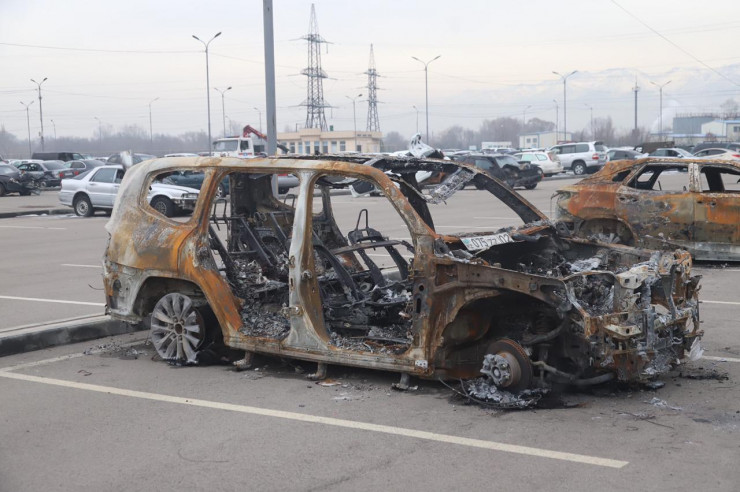 По данным начальника Службы спасения города Алматы Бейсегали Жунусова, сожжено 47 машин, обстреляно 48, еще 17 подверглись разбойным нападениям. Еще 40 авто принадлежат органам правопорядка, в том числе автозаки и грузовики.
