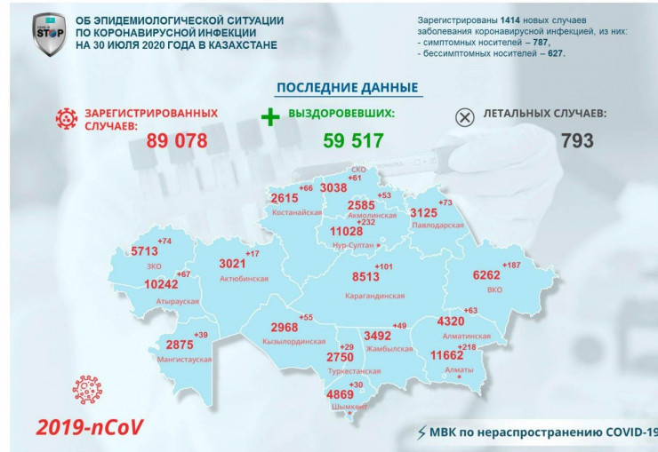 За прошедшие сутки (на 23.59 часов 30 июля) в Казахстане выявлены 1414 заболевших коронавирусной инфекцией, сообщает Tengrinews.kz.