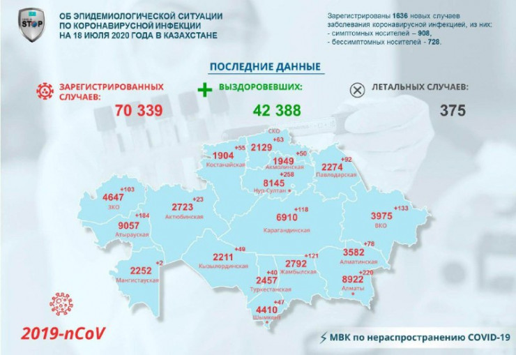 1636 новых случаев коронавируса зарегистрировали в Казахстане, передает Tengrinews.kz.