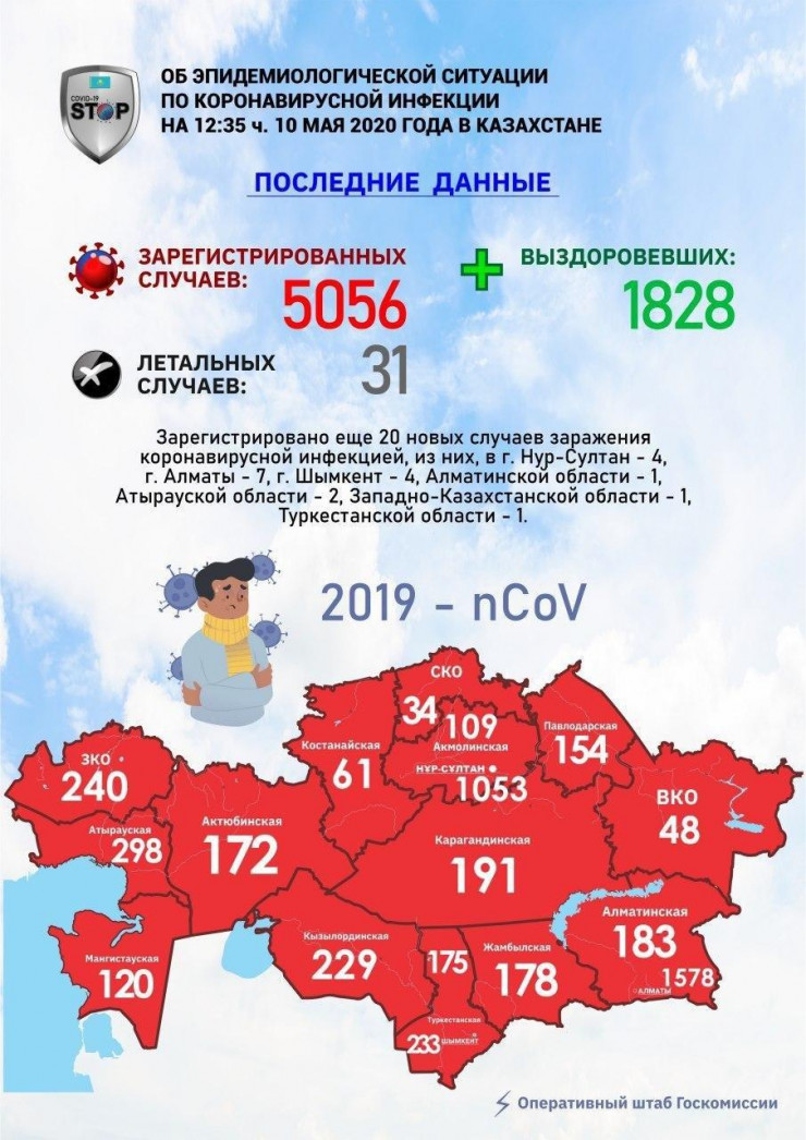 По данным на 12.35 часов 10 мая в Казахстане зарегистрировано еще 20 новых случаев заражения коронавирусной инфекцией: