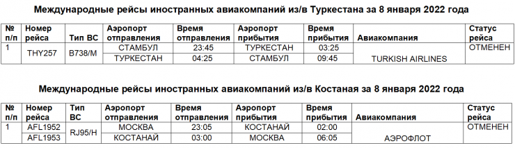 "Из/в города Алматы, Актау, Туркестан, Шымкент, Костанай иностранными авиакомпаниями отменено выполнение 21 рейса в/из городов Москва, Франкфурт, Баку, Дубай, Шарджа, Минск, Стамбул, Ургенч", - также говорится в сообщении МИИР.