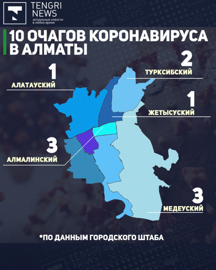 10 очагов коронавируса выявили в Алматы: три в Алмалинском районе, три - в Медеуском, два - в Турксибском и по одному в Жетысуском и Алатауском районах.