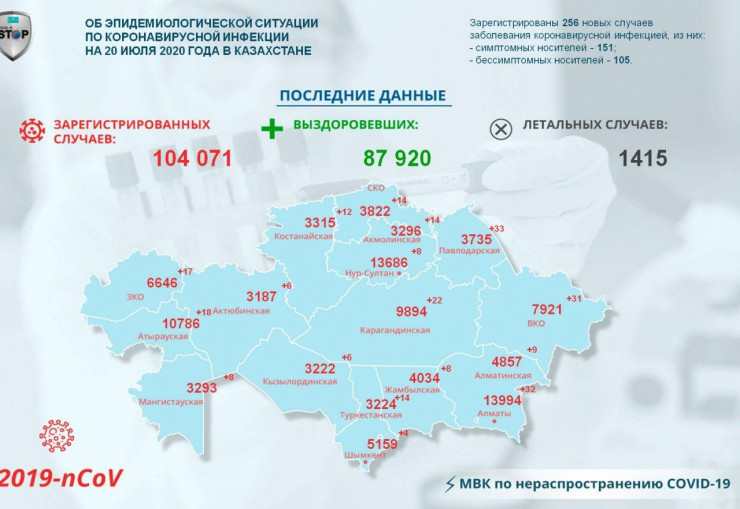За прошедшие сутки (по данным на 20 августа) в Казахстане выявлены 256 заболевших коронавирусной инфекцией, передает Tengrinews.kz со ссылкой на МВК по нераспространению COVID-19.