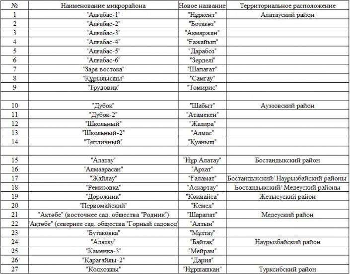Новые названия также получили микрорайоны Алғабас-1-6,  Қарағайлы-2, Каменка-3, Дубок-2.