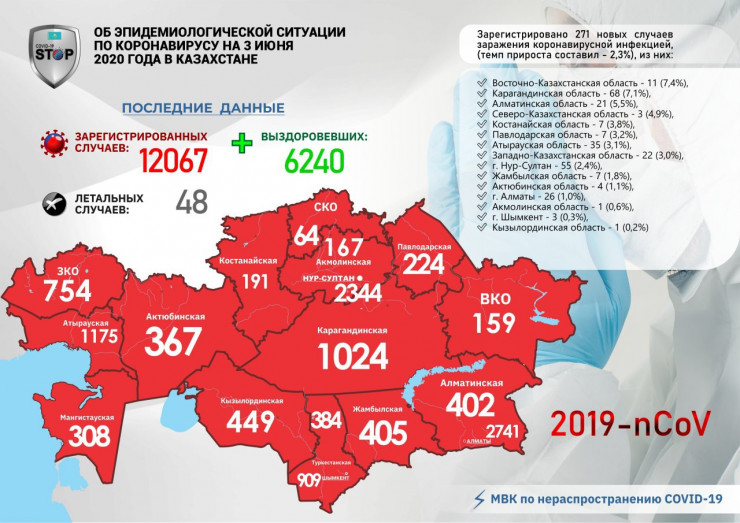 Всего в Казахстане подтверждено 12 067 случаев коронавируса, выздоровело 6240 человек, скончались 48.