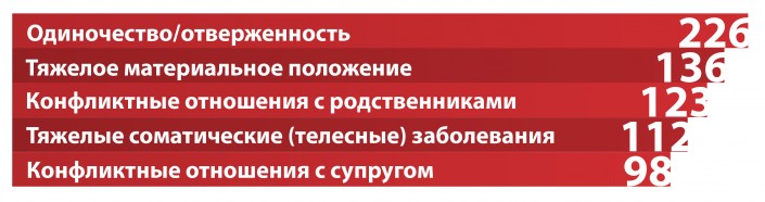 Главные известные факторы, по мере снижения количества известных причин: одиночество (с чувством отверженности) - 226 случаев, тяжелое материальное положение (банкротство, долги) - 136,  конфликтные отношения с родственниками - 123, тяжелые соматические (телесные) заболевания - 112,  конфликтные отношения с супругом - 98, неблагоприятные жилищные условия, разрыв семейных отношений (развод), утрата (смерть) близкого человека, конфликтные отношения с родителями, страх наказания, позора (уголовная ответственность), конфликтные отношения по месту учебы (работы), утрата социального статуса (престижа), нежелательная беременность.