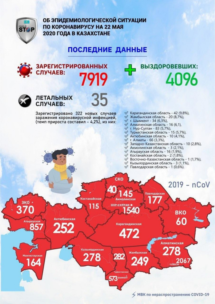 Всего в стране подтверждено 7919 случаев COVID-19. Вылечились от коронавируса 4096 человек.