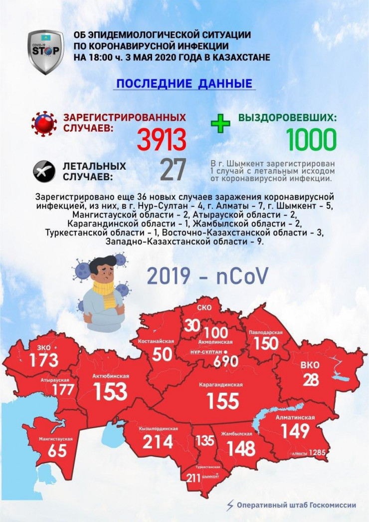 Зарегистрировано еще 36 новых случаев заражения коронавирусной инфекцией, из них в Нур-Султане - 4, в Алматы - 7, в Шымкенте - 5, в Мангистауской области - 2, в Атырауской области - 2, в Карагандинской области - 1, в Жамбылской области - 2, в Туркестанской области - 1, в Восточно-Казахстанской области - 3, в Западно-Казахстанской области - 9.