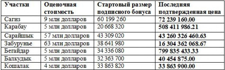 Самая высокая цена предложена за участок Сарайшык – более 43 миллиардов тенге, цена взлетела в несколько раз (стартовая – 43,3 миллиона тенге), далее идет участок Забурунье – более 16 миллиардов тенге.