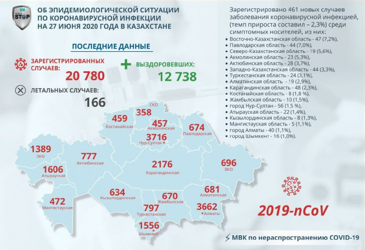 За прошедшие сутки (27 июня) в Казахстане выявлен 461 заболевший коронавирусной инфекцией, сообщает Tengrinews.kz.