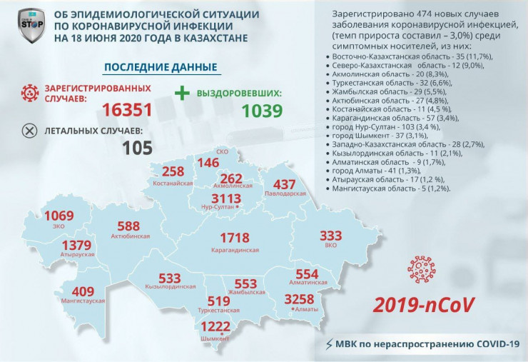 За прошедшие сутки (18 июня) в Казахстане выявлено 474 заболевших коронавирусной инфекцией, сообщает Tengrinews.kz.