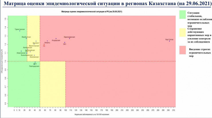 Опубликована матрица оценки эпидемиологической ситуации в регионах Казахстана на 29 июня: