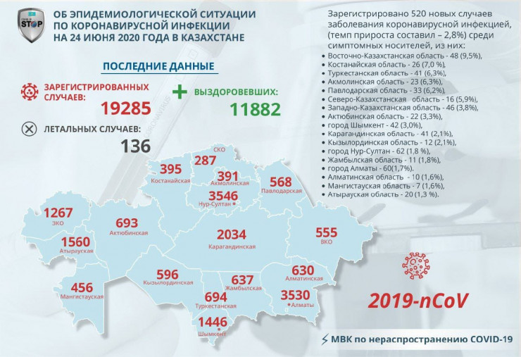 За прошедшие сутки (24 июня) в Казахстане выявлено 520 заболевших коронавирусной инфекцией, передает Tengrinews.kz.
