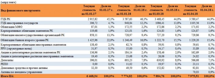 К началу апреля суммарные пенсионные накопления граждан Казахстана составили 7 974,07 миллиарда тенге, увеличившись на 2,5 процента с начала года. За 2017 год пенсионные накопления выросли на 16,4 процента, или 1 095,5 миллиарда тенге.