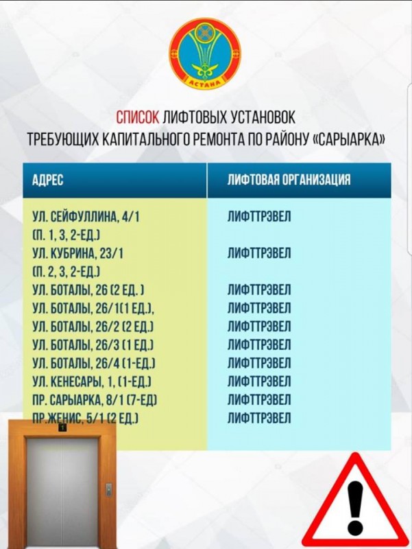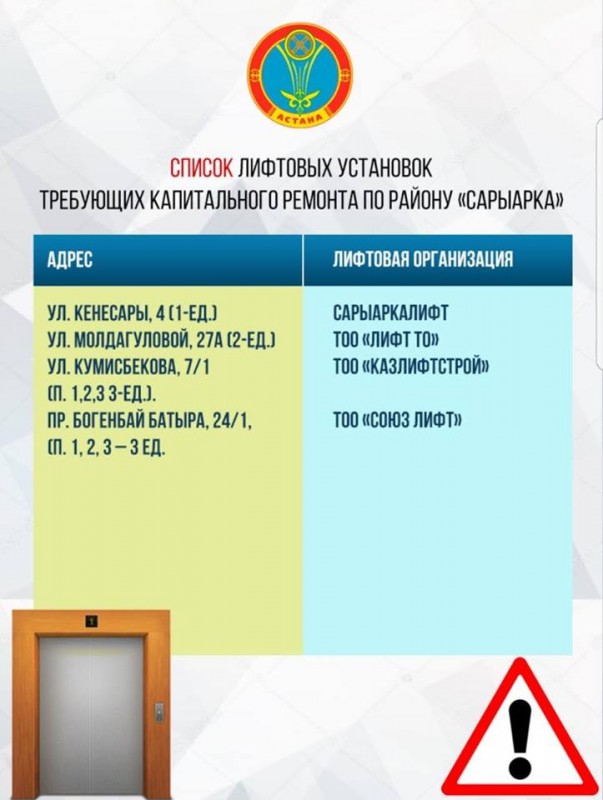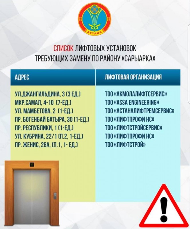 Аким опубликовал список лифтовых установок, требующих замены или капитального ремонта. "Таких лифтов сейчас 78, находящихся в ненадлежащем техническом состоянии", - отметил Арман Турлубек.