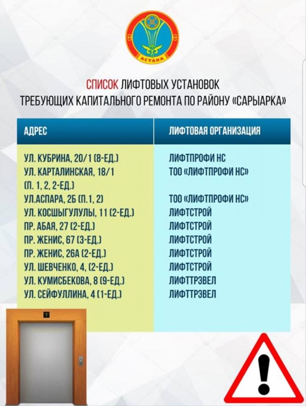 "Только в нашем районе функционируют 1 227 лифтов, из них 15 лифтовых установок требуют полной замены, а 63 - капитального ремонта! При этом жители их еще и эксплуатируют, эти аварийные лифты, ежедневно подвергая свою жизнь опасности или попадая в различные резонансные неприятные ситуации", - добавил Турлубек.