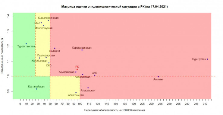 Согласно матрице оценки эпидемиологической ситуации в регионах Казахстана на 17 апреля, в "красной" зоне: Нур-Султан, Алматы, Шымкент и Атырауская, Актюбинская, Акмолинская, Западно-Казахстанская, Карагандинская области.
