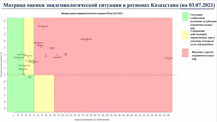 Согласно матрице оценки эпидемиологической ситуации в регионах Казахстана на 3 июля, в "красной" зоне находятся Нур-Султан, Алматы, Шымкент, Акмолинская, Атырауская, Западно-Казахстанская, Карагандинская, Мангистауская области.