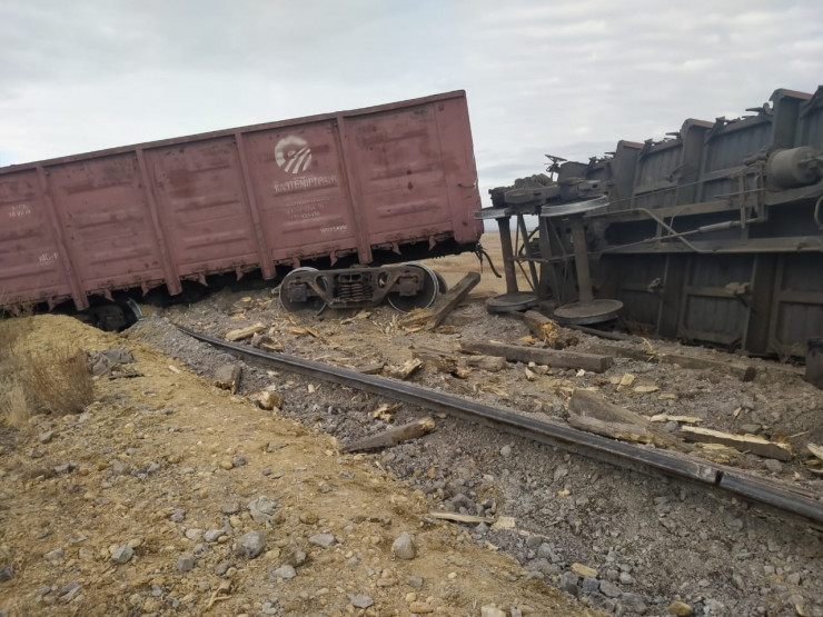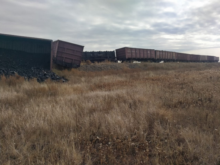 "2 ноября в 06.00 на 27-м километре железнодорожного перегона станции Ботакара в Бухар-Жырауском районе Карагандинской области на подъездных путях произошел сход колесных пар восьми вагонов, груженных углем, в том числе двух с опрокидыванием", - сообщил официальный представитель МЧС Талгат Уали.