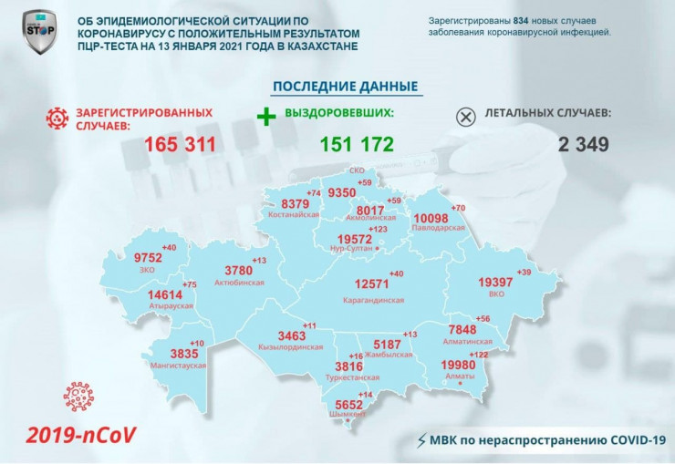 За прошедшие сутки 13 января в Казахстане зарегистрированы 834 новых случая заболевания коронавирусной инфекцией, передает Tengrinews.kz со ссылкой на данные Межведомственной комиссии по нераспространению COVID-19.