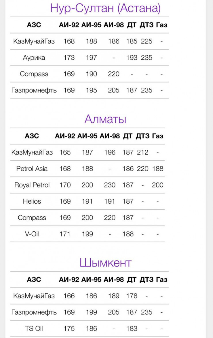 В Алматы АИ-92 стоит от 165 до 171 тенге, АИ-95 - от 187 до 200 тенге, АИ-98 - от 191 до 230 тенге.