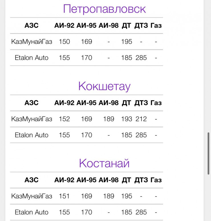 Так, в Нур-Султане стоимость АИ-92 составляет от 168 до 177 тенге за литр, АИ-95 - от 188 до 197 тенге, АИ-98 - от 186 до 220 тенге.
