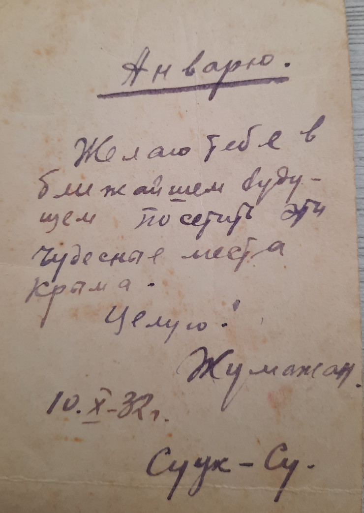 Менің әкем мен анамның махаббаты ерекше болыпты. Әкем қазақтарды колхоздарға зорлықпен апару, жұмысқа жегу, малын тартып алу сияқты озбырлықтарға қарсылық білдірген, тәуелсіздік үшін күрескен. Ата-анам сол мақсат жолында қолда бардың бәрінен бас тартқан. Әкем анама түрлі әдемі ашықхаттар жазған. Мына ашықхаттың екінші жағында Қырымның ең көрікті жерлерінің суреті болған.