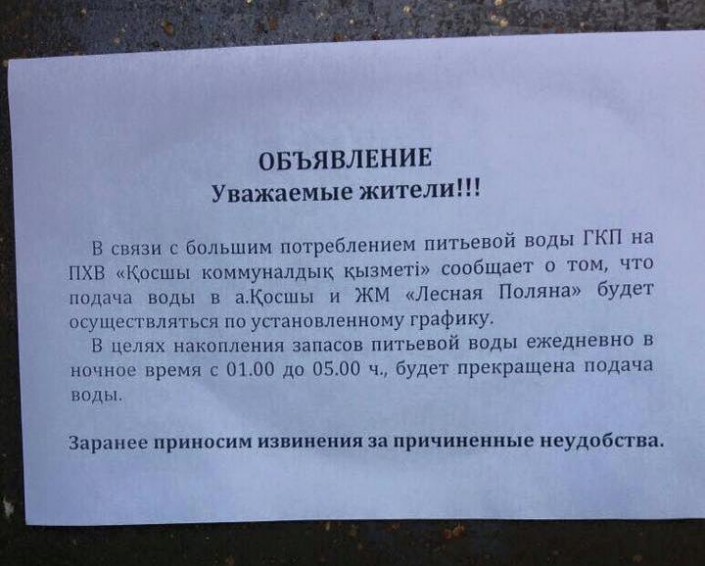 Такое объявление жители поселка Косшы распространяют в социальных сетях. При этом люди, отмечают, что проблемы с водоснабжением есть не только в ночное время, но и днем.