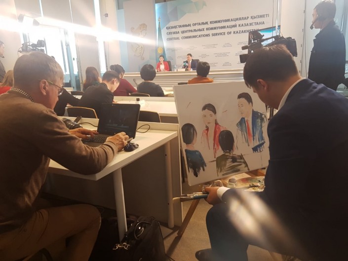 На протяжении всего мероприятия среди участников брифинга находился художник, который писал маслом портрет акима.