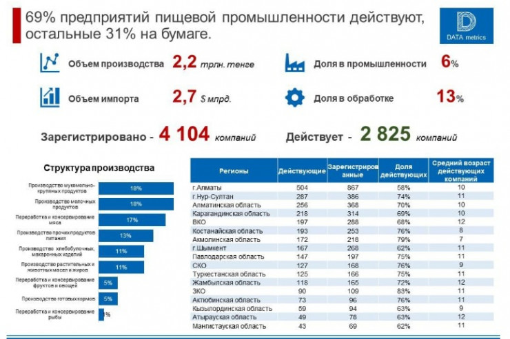 Ранее в Петропавловском издании появилась информация со ссылкой на исследование компании DATAmetrics о том, что 24 процента из зарегистрированных промышленных предприятий в СКО на самом деле не действует. В самом исследовании уточняется, что речь идет только о пищевых предприятиях. По данным бюро статистики, на декабрь 2021 года в пищевой промышленности в Казахстане зарегистрированы 4104 юридических лица, однако из них действуют 2825 юридических лиц, или 69 процентов. В СКО, в частности, действуют только 76 процентов пищевых предприятий.