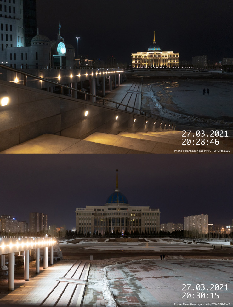 Ровно в 20.30 в столице отключили внешнюю декоративную подсветку резиденции Президента и монумента в центре города. Фотограф Tengrinews.kz запечатлел этот момент.