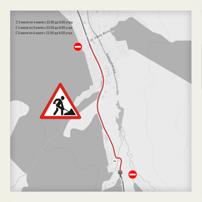 Также из-за ремонта дорог будет перекрыт участок по улице Дулати от экологического поста до улицы Сапар Жолы. С 3 июля по 4 июля с 22:00 до 8:00, с 4 по 5 июля и с 5 по 6 июля в это же время.
