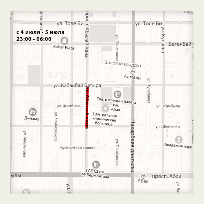 4 июля ночью проезд автотранспорту по Абылай хана перекроют от улицы Шевченко до Кабанбай батыра.