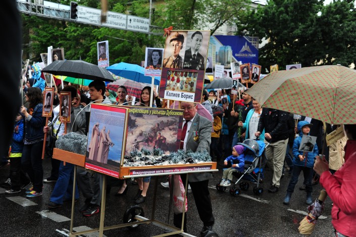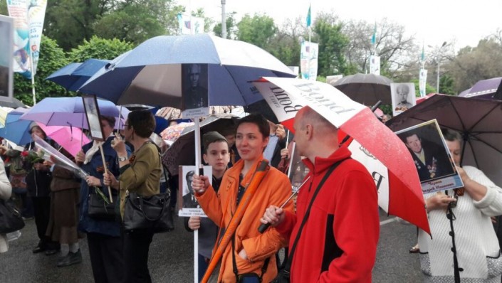 В Алматы, несмотря на дождь, состоялось крупнейшее казахстанское шествие "Бессмертного полка", в котором приняли участие, по оценке организаторов, более 20 тысяч человек, передает корреспондент Tengrinews.kz. Жители города с портретами ветеранов Великой Отечественной войны и зонтами прошли от площади "Астана" до парка имени 28 гвардейцев-панфиловцев.