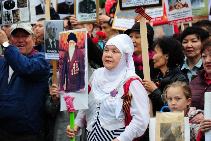 Алматинцы маршировали по улицам города с портретами ветеранов