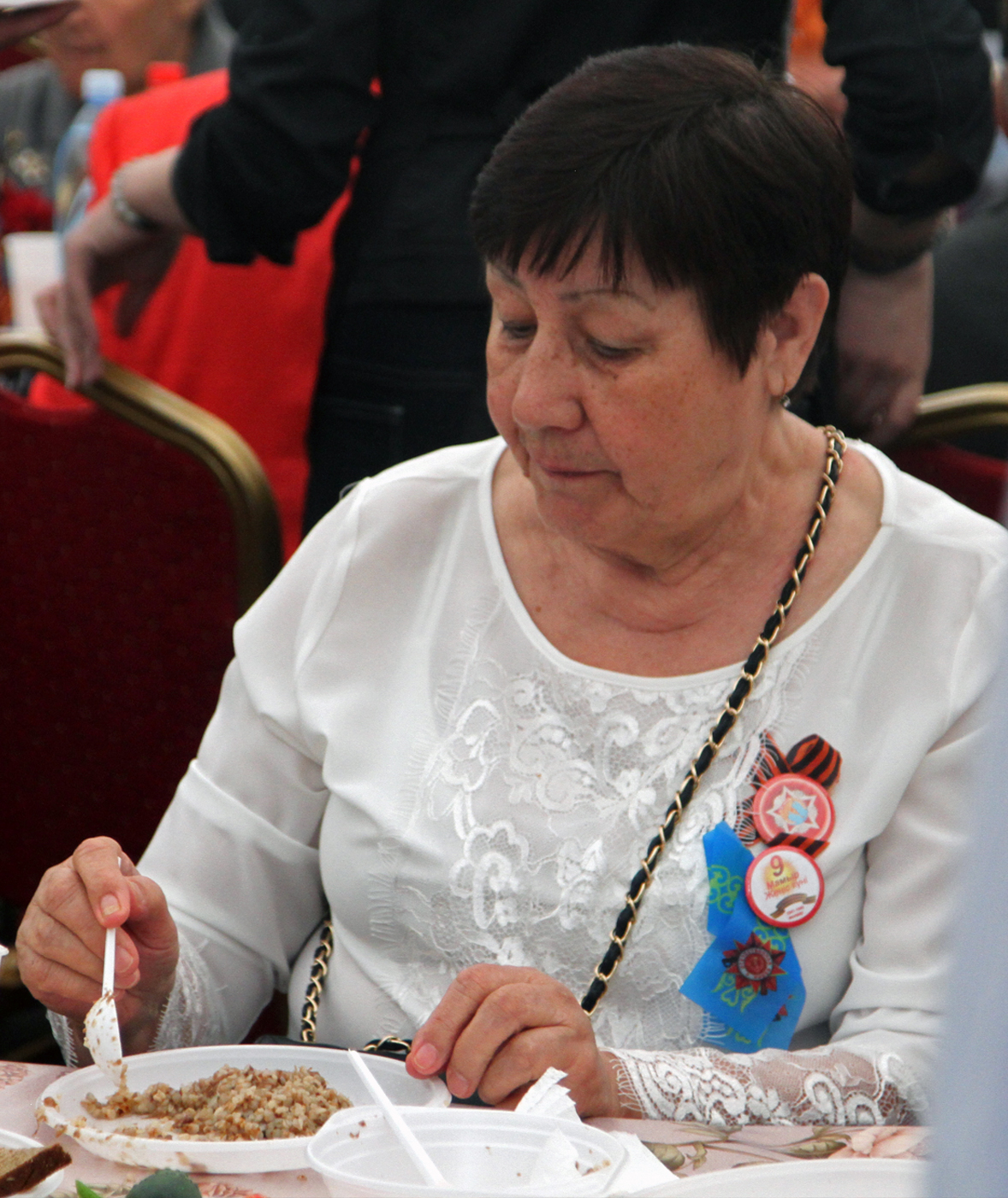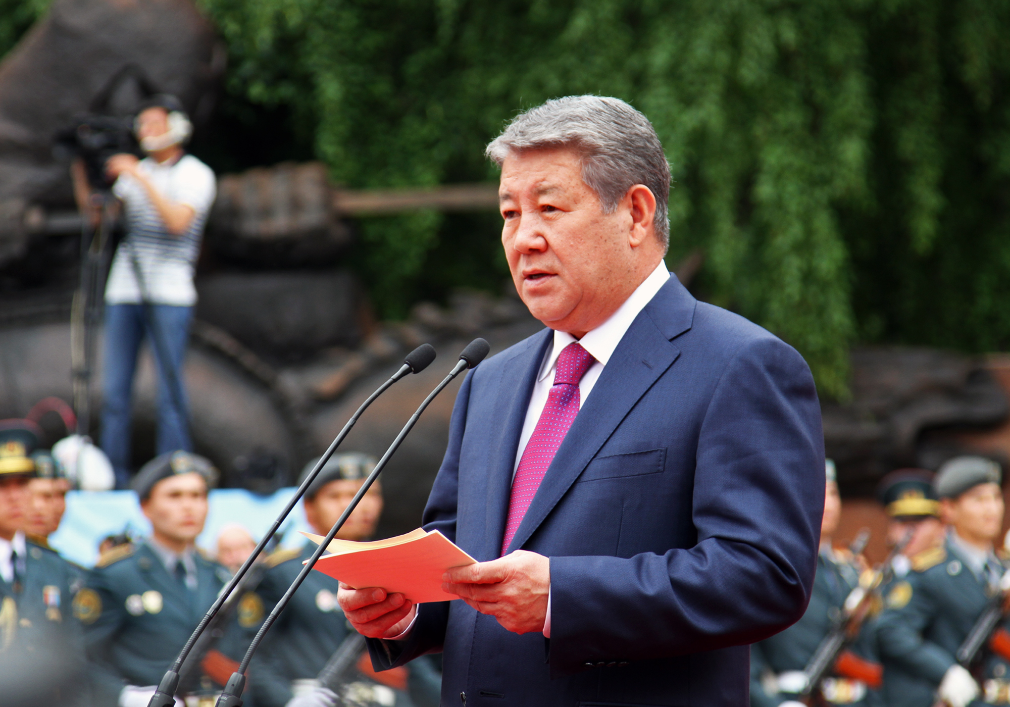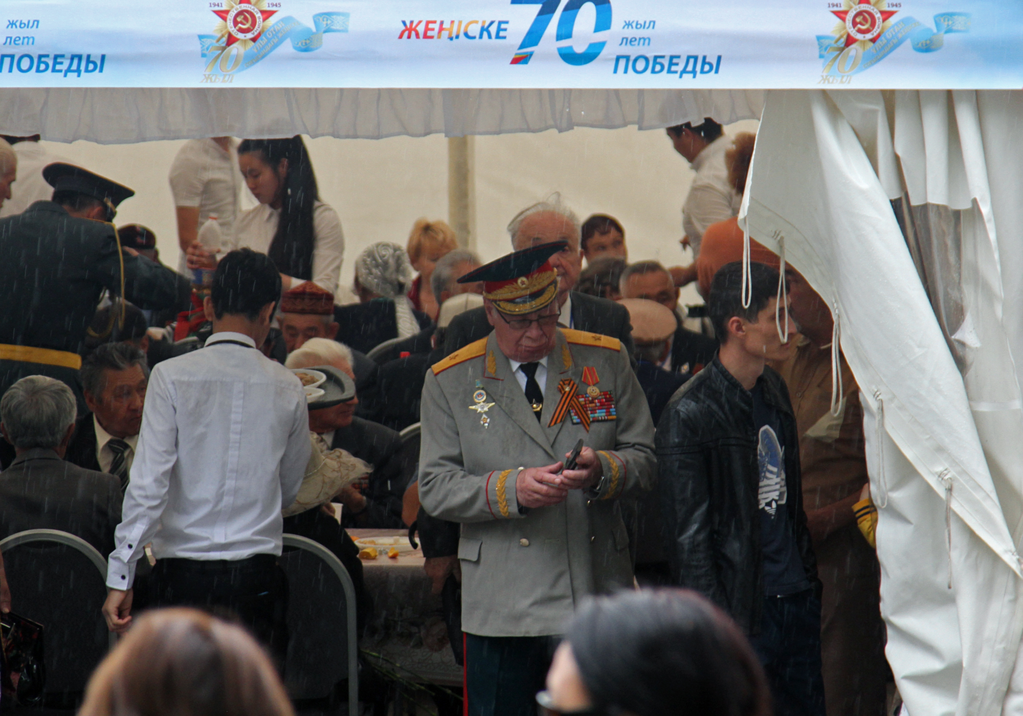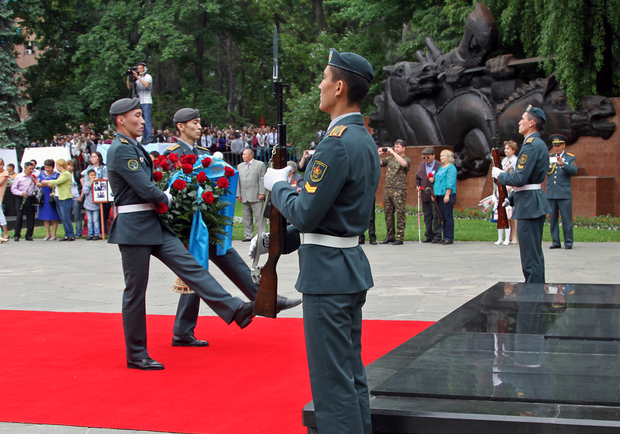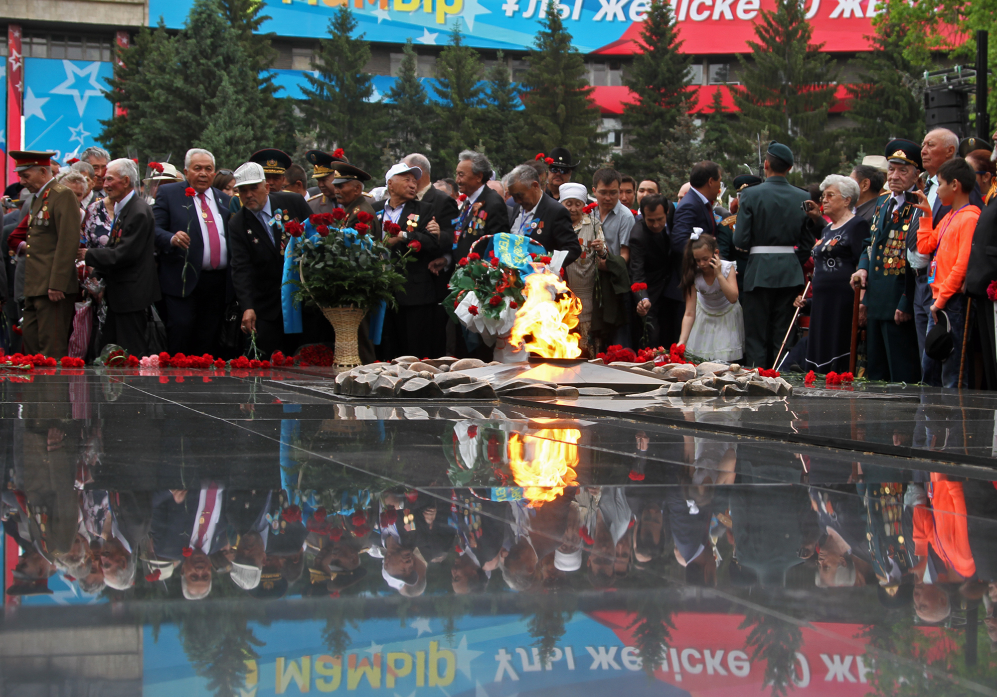После речи градоначальника прозвучал гимн Казахстана. Затем состоялось возложение цветов. Всего в парк сегодня пришли более 5000 человек, чтобы послушать и спеть песни военных лет. Собравшиеся поздравляли ветеранов и кричали "Спасибо!". В парке организовали праздничный обед для ветеранов и концерт. Полевую кухню развернули возле Свято-Вознесенского собора. Также сегодня, 9 мая, на площади Астана в 20.00 начнется праздничный концерт. А залпы юбилейного салюта будут даны в 22.00 одновременно с двух точек мегаполиса - площади Астана и озера Сайран.