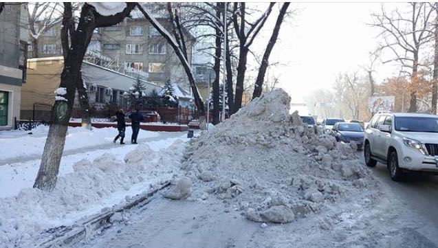 В частности, пользователь Facebook Вера Ляховская сфотографировала неубранный сугроб, лежащий прямо на проезжей части, в районе пересечения улиц Шевченко и Байтурсынова.