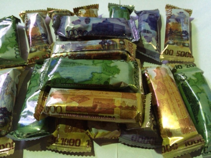 "У меня есть партнеры из России, которые производят кондитерские изделия. Там функционирует целая фабрика про производству таких шоколадных конфет. Они уже давно выпускают подобные конфеты с оберткой в виде доллара и евро. После того, как я предложил им идею с тенге, мы запустили совместный проект. Реализуем мы продукцию в Алматы, Шымкенте, Астане и ряде других северных городов страны", - поделился он.
